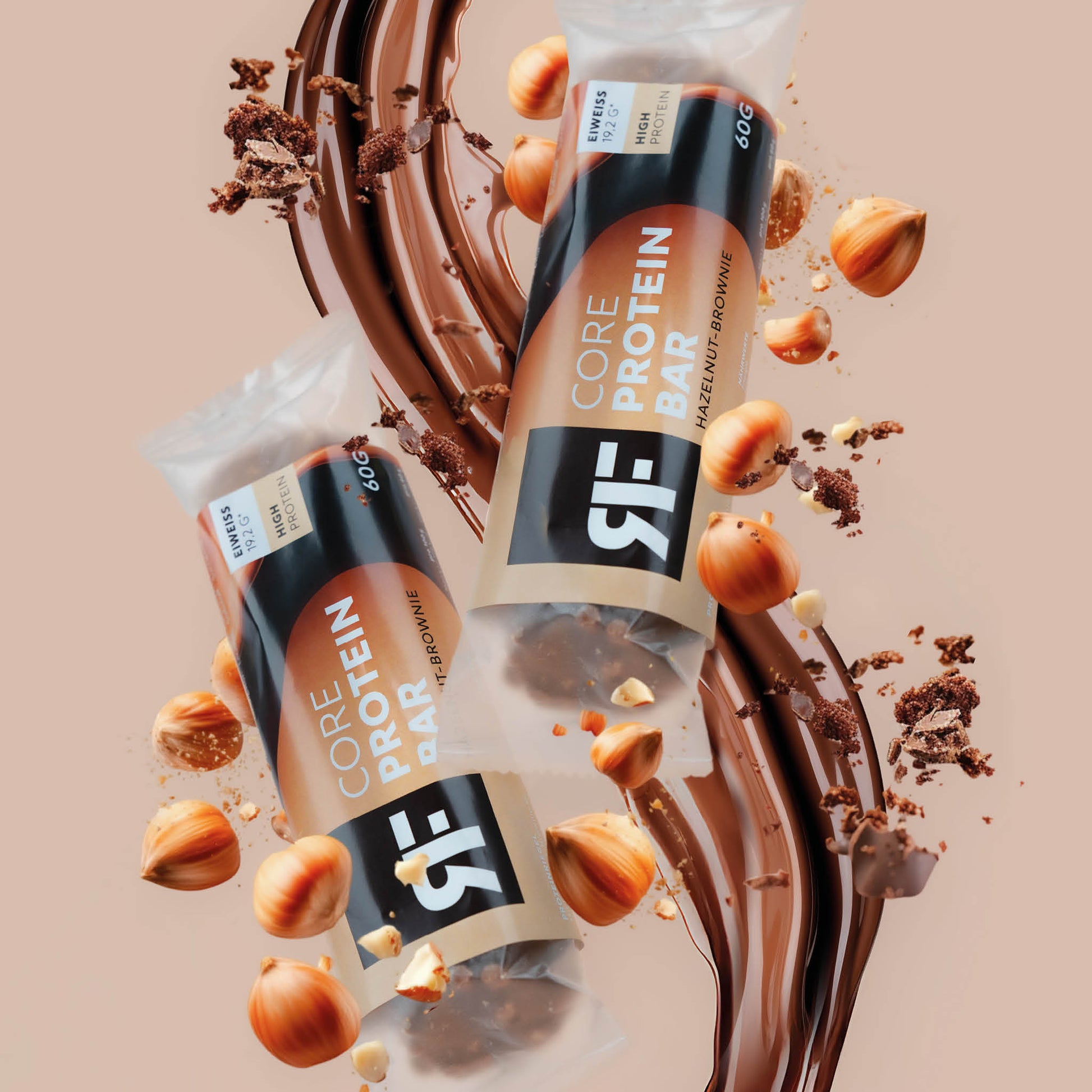 Verkehrsbezeichnung: Riegel mit hohem Proteingehalt mit Haselnuss-Brownie Geschmack und Schokoladen-Überzug.
